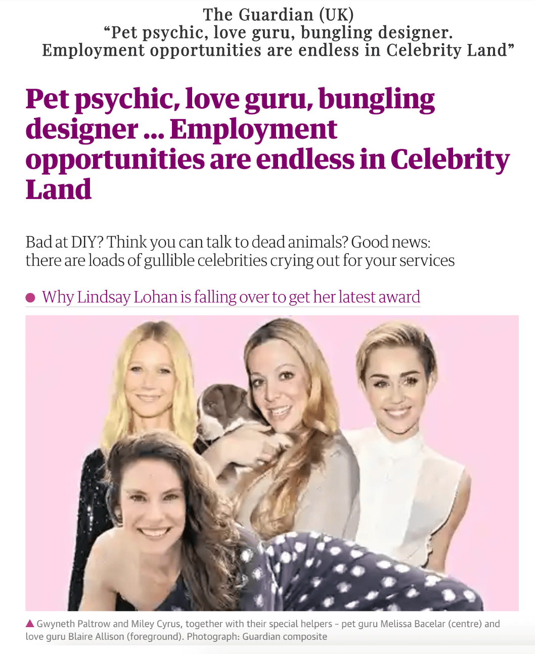 The Guardian (UK) – “Pet psychic, love guru, bungling designer. Employment opportunities are endless in Celebrity Land”